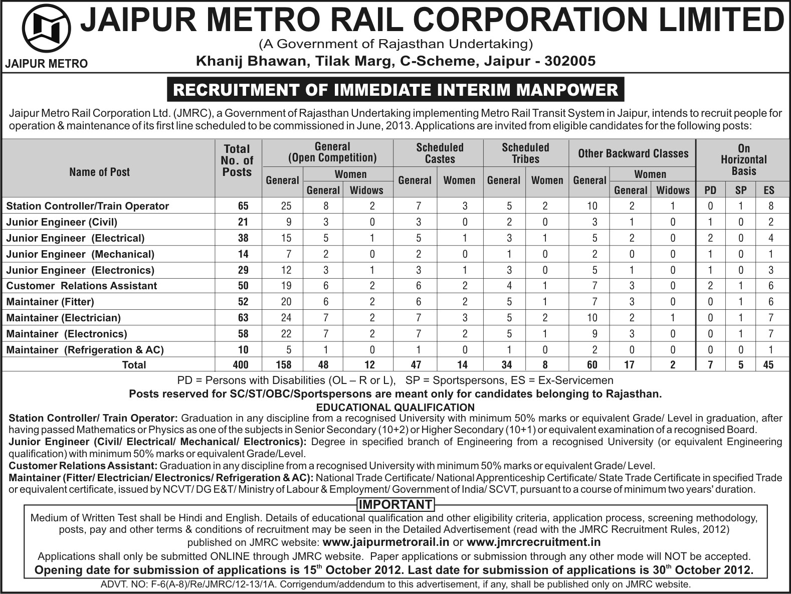 Jaipur Metro Rail Corporation is a young and vibrant organisation, all set to change the picture of the Pink City of Jaipur! We shall be opening our first line in June 2013 and we are recruiting.